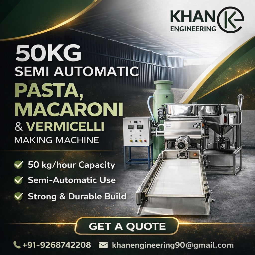 Increase your production efficiency with Khan Engineering’s 50 KG/HR Semi Automatic Pasta Making Machine, designed for businesses looking for a cost-effective yet powerful pasta production solution.
